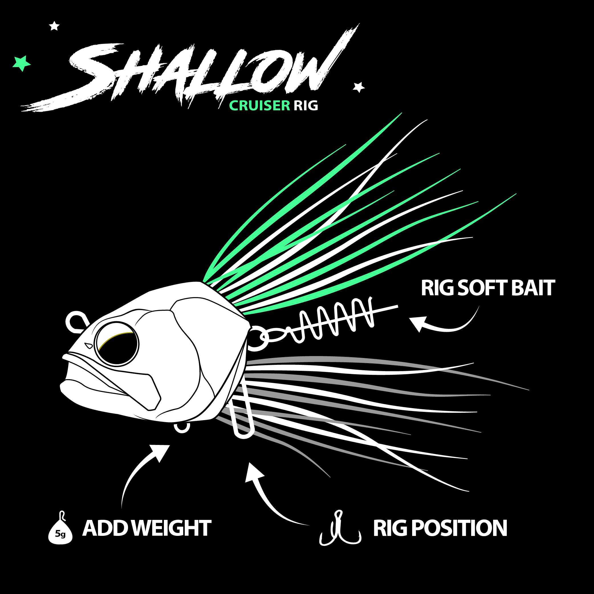 Le shallow cruiser rig est une tête en résine sans plomb avec un screw articulé vous permettant de monter tout vos leurres souples (twin, grub, shad).